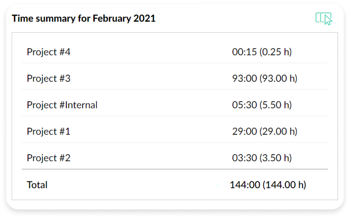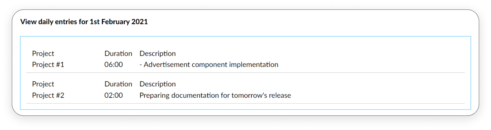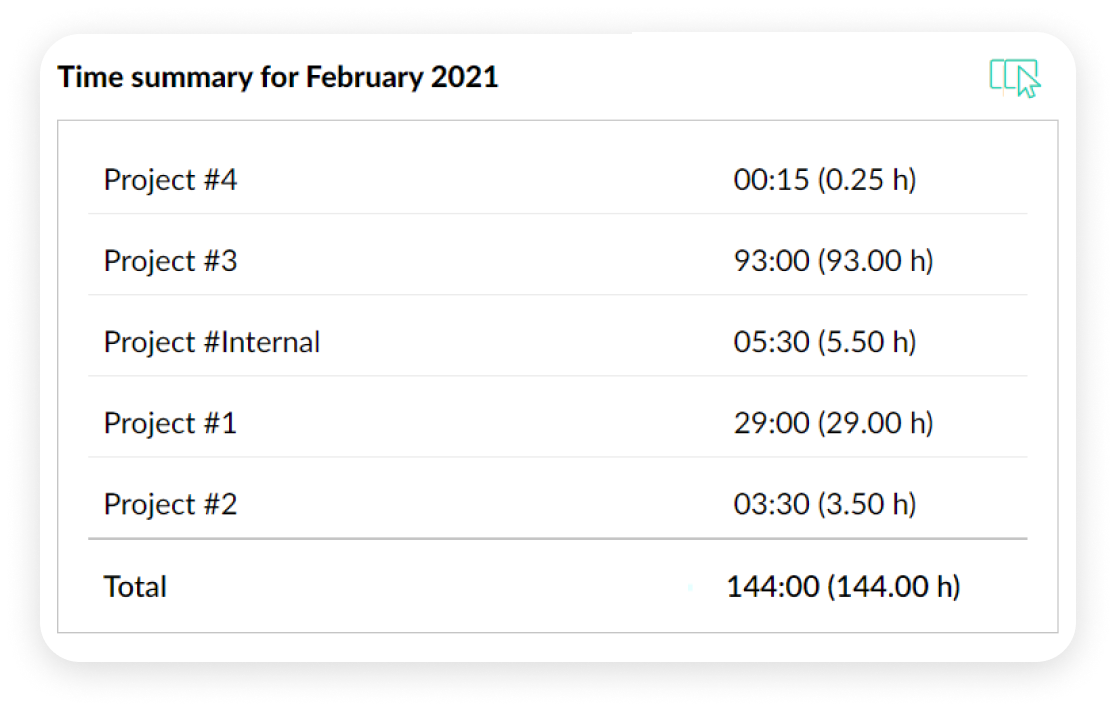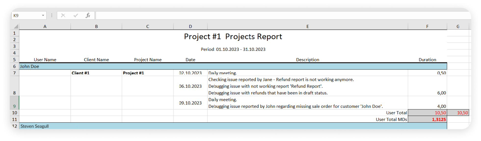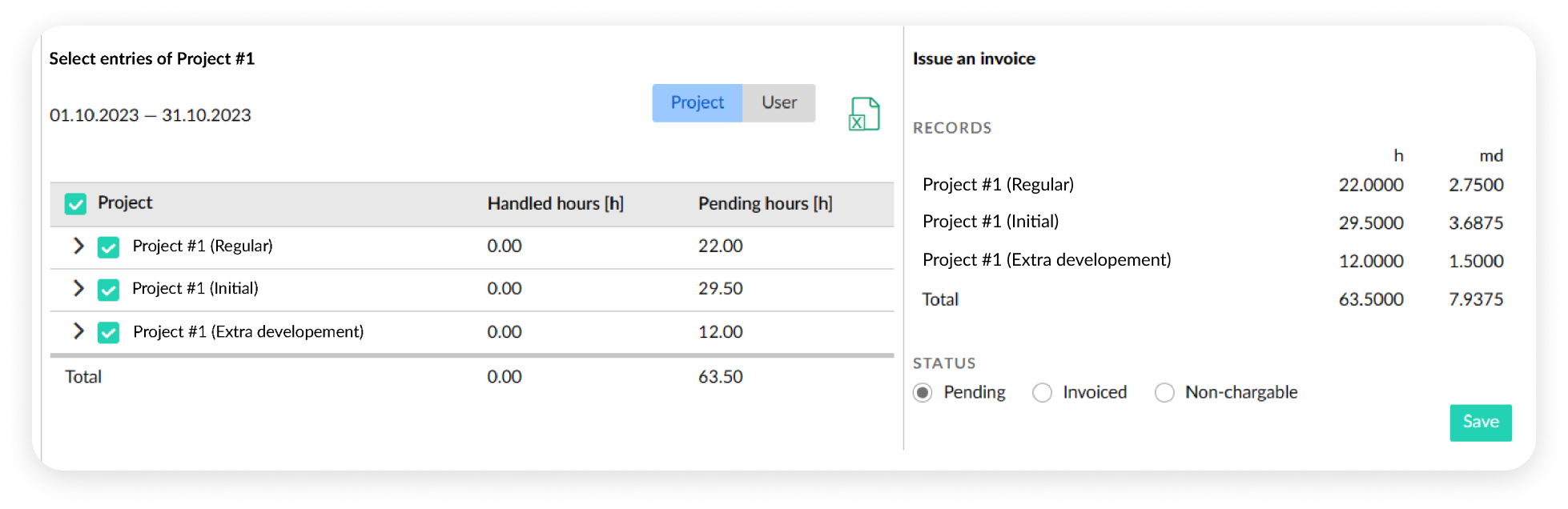 One can view both visual aggregated summaries of work done on a certain project or export Excel files with detailed entries.