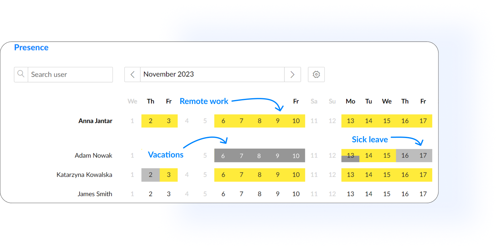 People can easily view their team’s members availability. Including remote days, sick leaves, vacations and more.